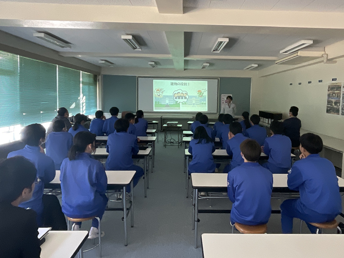 建築・建設分野の仕事の内容や魅力、県内の建築物の紹介、進路先の紹介など行いました。