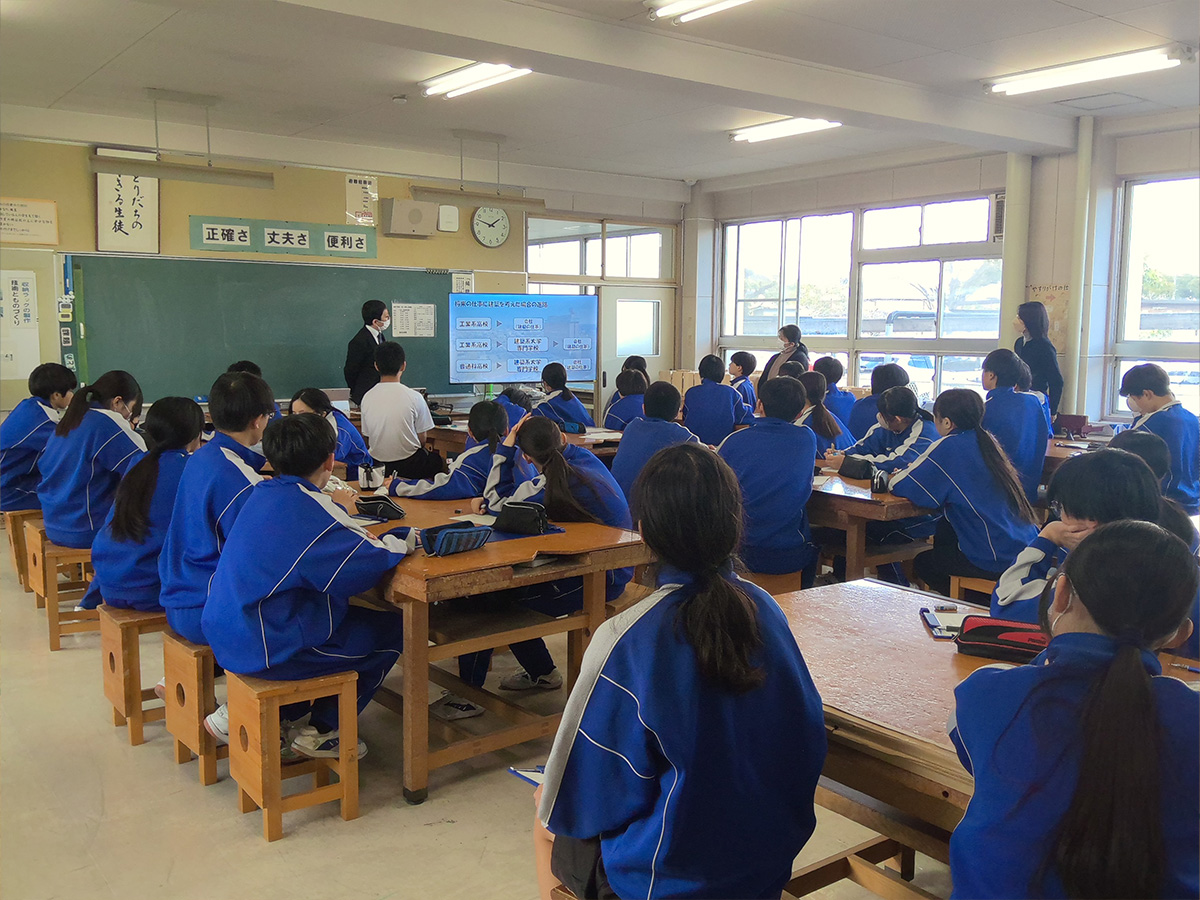 建設産業の魅力を理解してもらい、将来の職業の選択肢のひとつとしてもらうことを目的として、郡上市立八幡西中学校、岐阜市立岐阜中央中学校、輪之内町立輪之内中学校、北方町立南学園の生徒を対象に「出前授業」を実施しました。