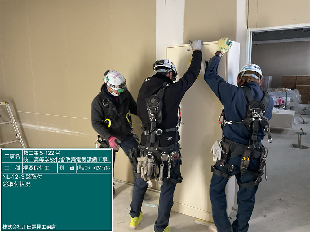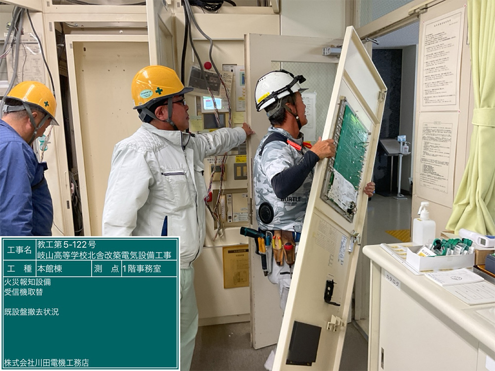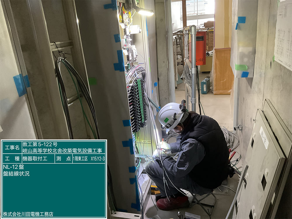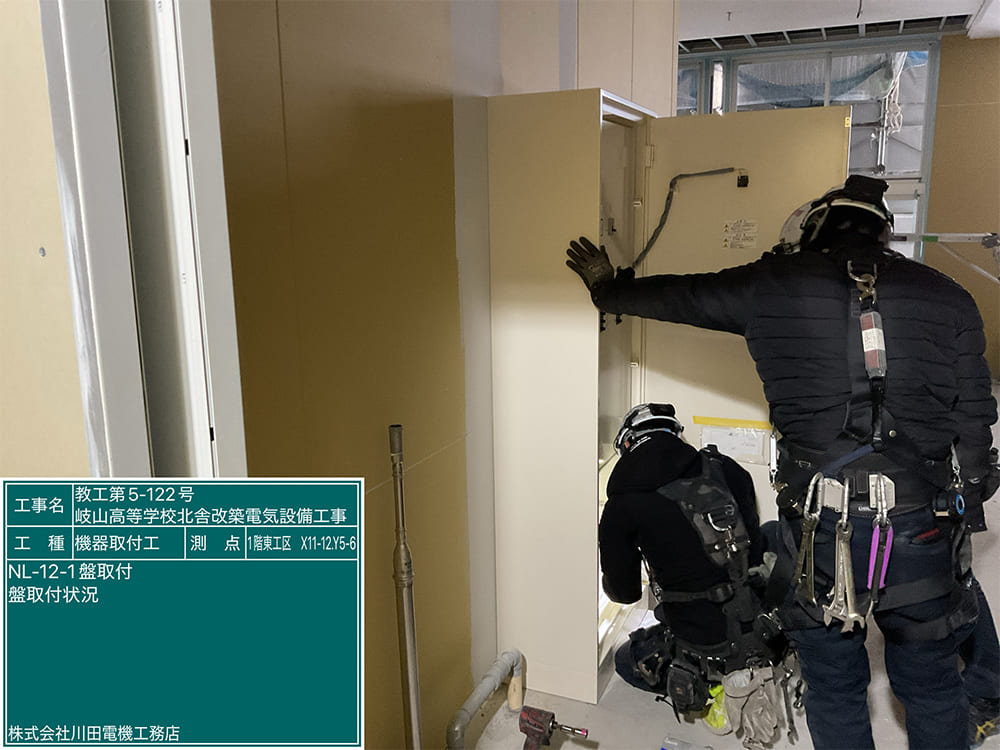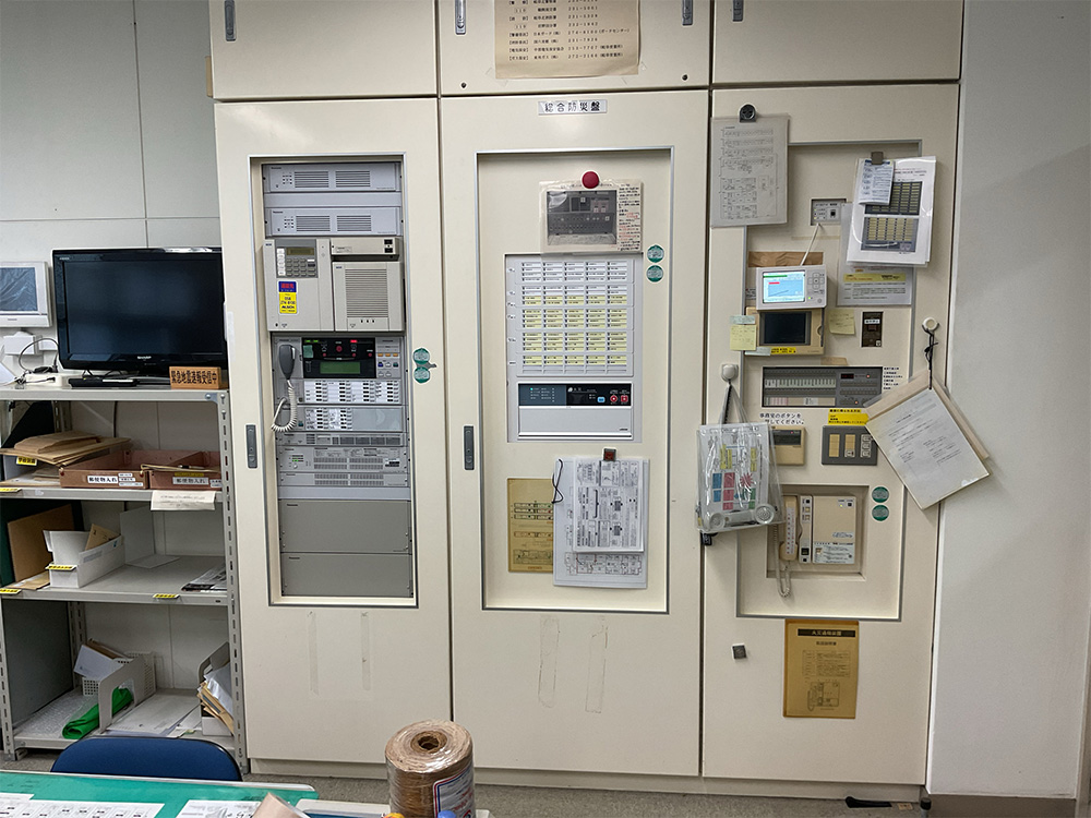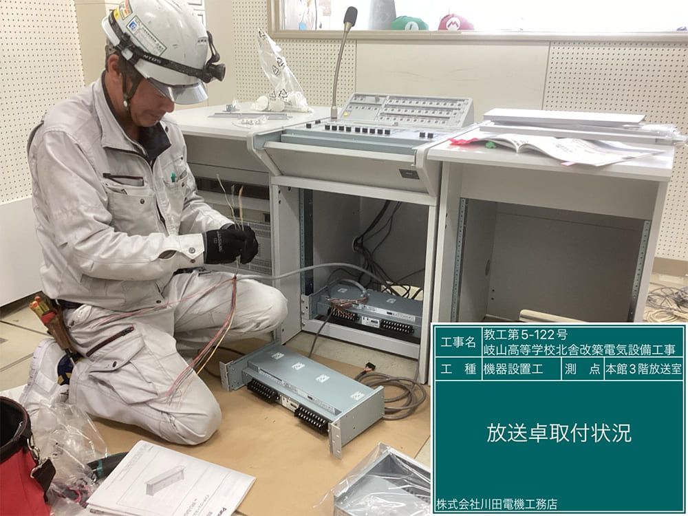 総合盤には、校内放送設備、防犯カメラ、火災報知機、トイレ呼び出しなど学校を管理するために必要な設備を集約しています。操作パネルなどを設置し、予め配線しておいたケーブルと接続します。今回の工事では、既存校舎に既設の総合盤があるため、機器の一部取替や新築校舎の配線を接続する工事などを行いました。