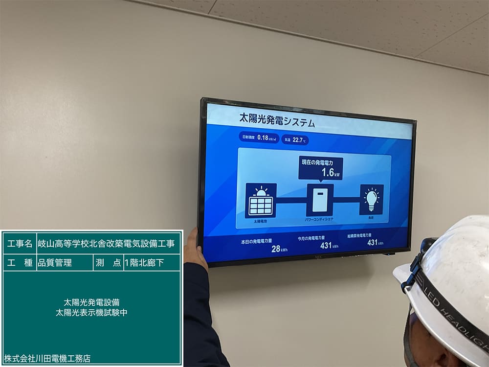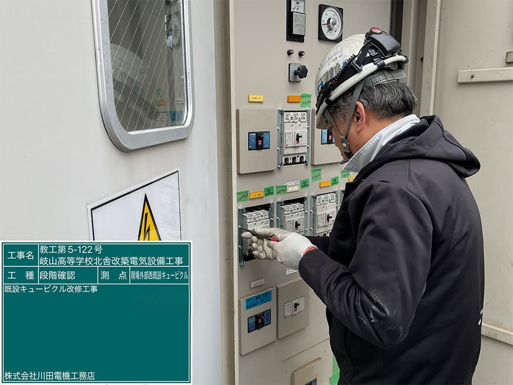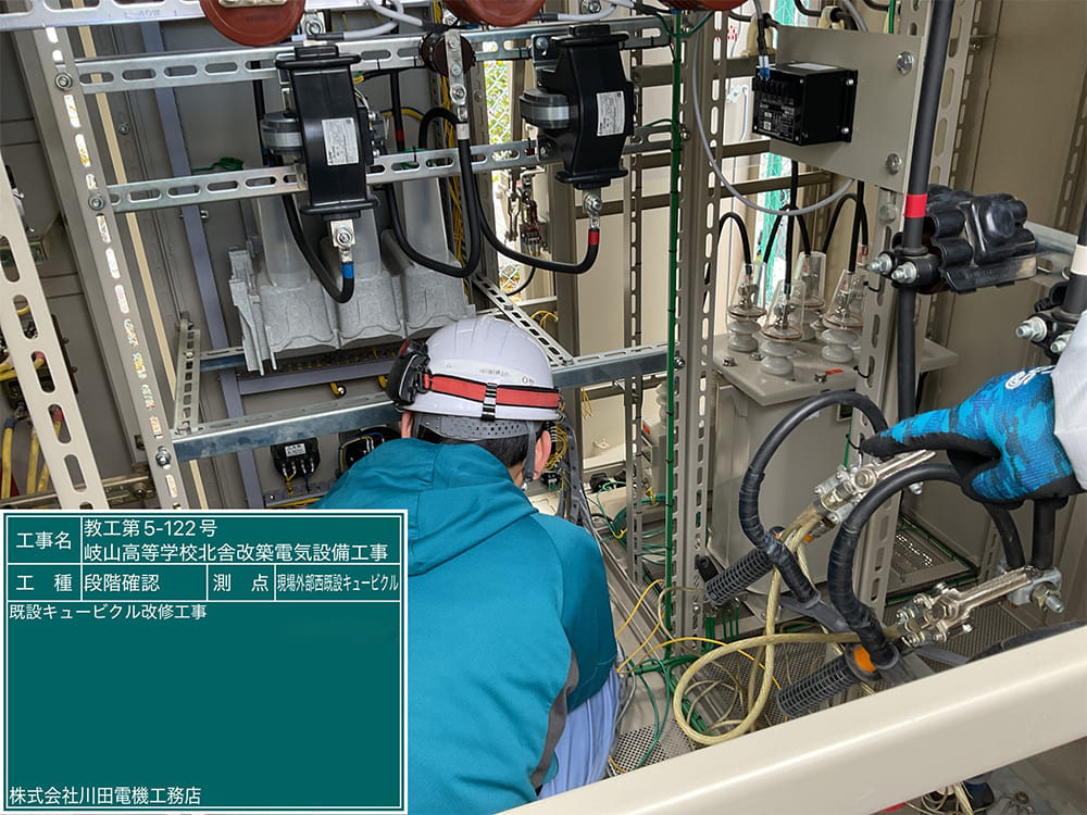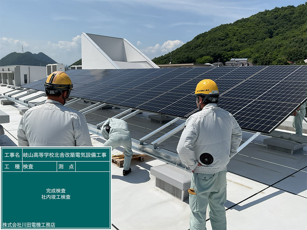 今回の工事では、学校の敷地内に既に受変電設備があるため、既設キュービクルのブレーカ取替や新築校舎の配線を接続する工事を行い、校舎の屋上に太陽光発電設備を設置しました。