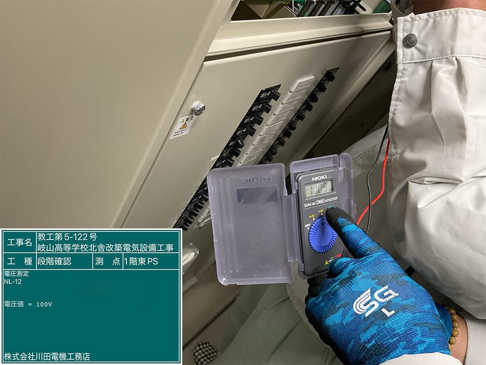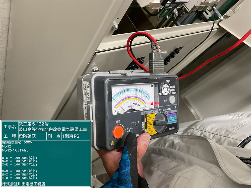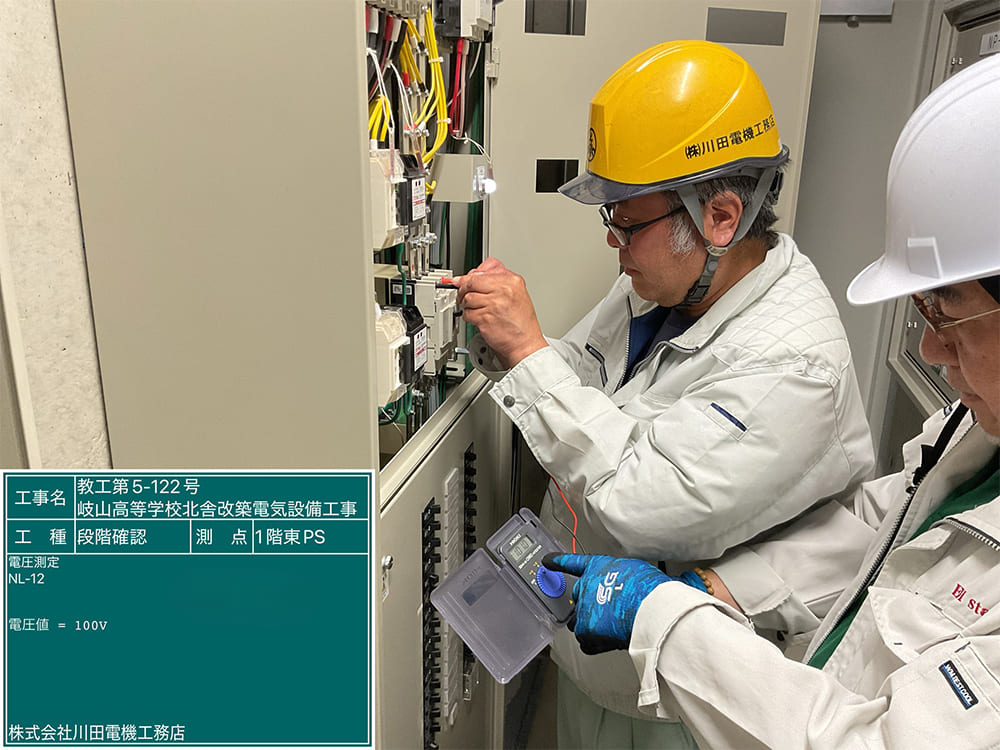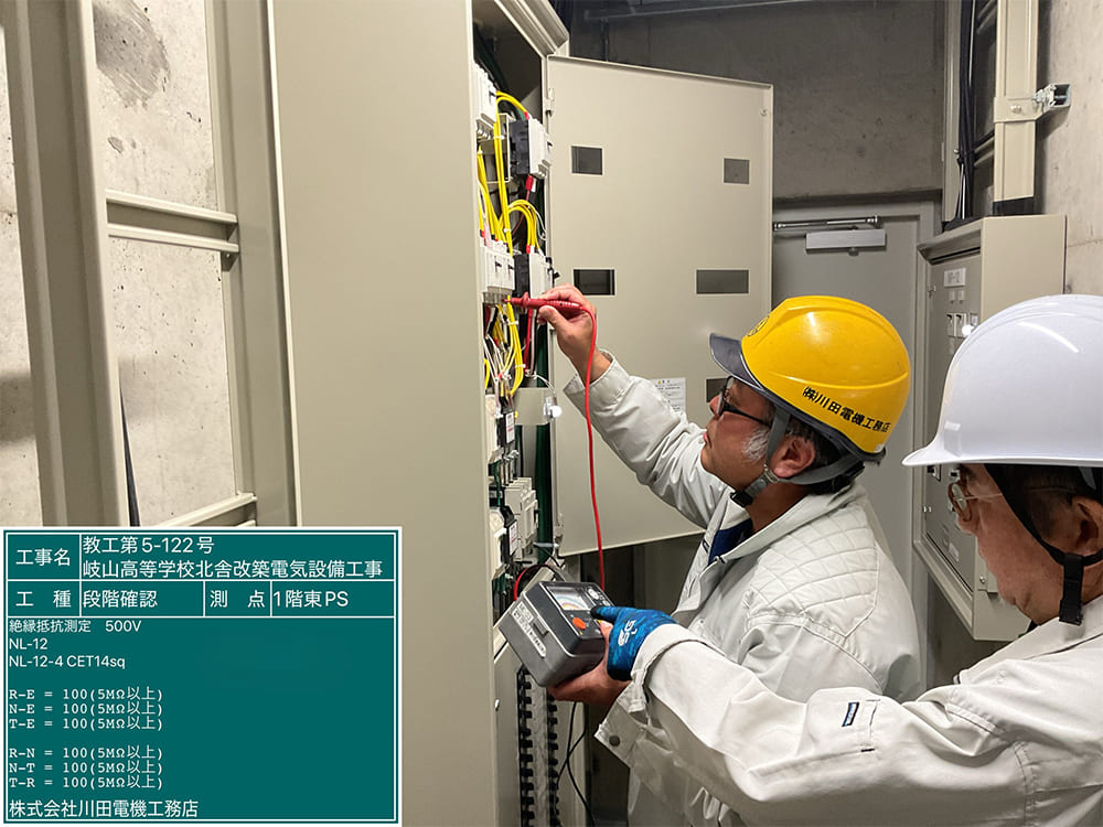 工事が完了したら、建物内や敷地内の電気設備機器に電気が正常に送れているかチェックをします。漏電していないか、電圧が基準値となっているかなど、計測機器により1つ1つ丁寧に確認をし、点検記録などに点検結果を記入していきます。