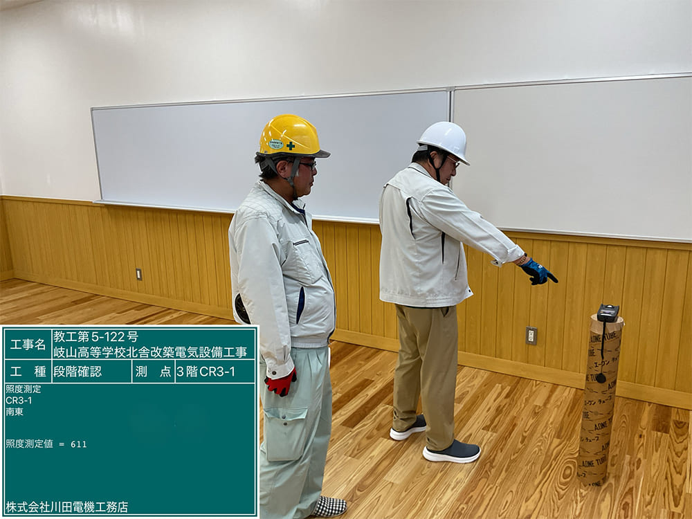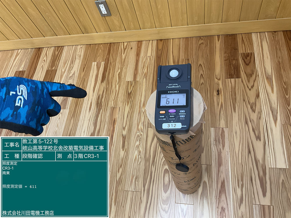 明るさを示す指標の1つで、部屋の用途に応じ設計時に値を決めていきます。現場では設計どおりの照度となっているか、1部屋につき複数箇所測定し、その平均値が設計照度と同じか確認をしていきます。