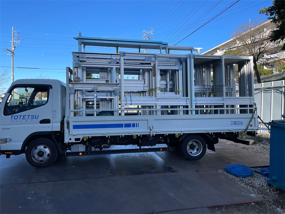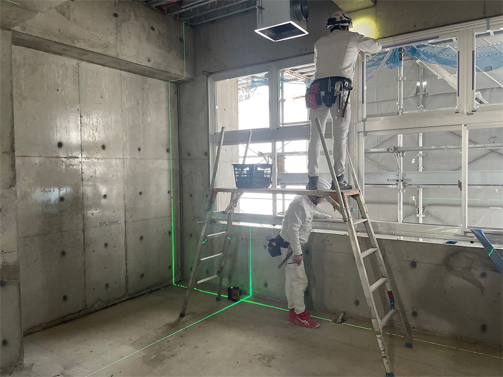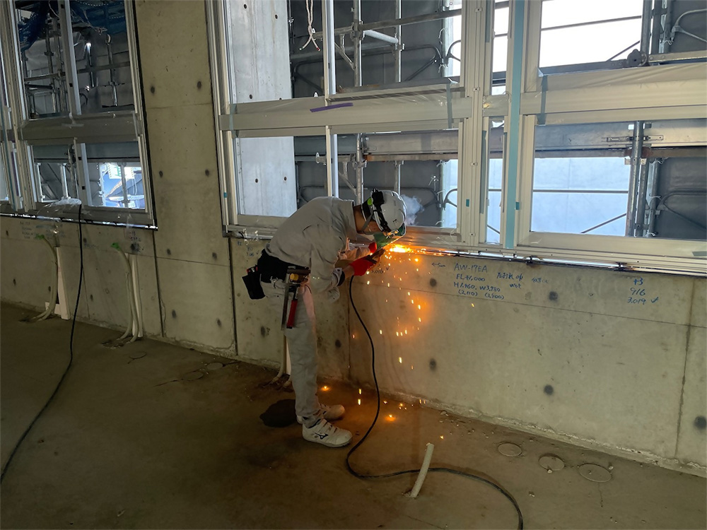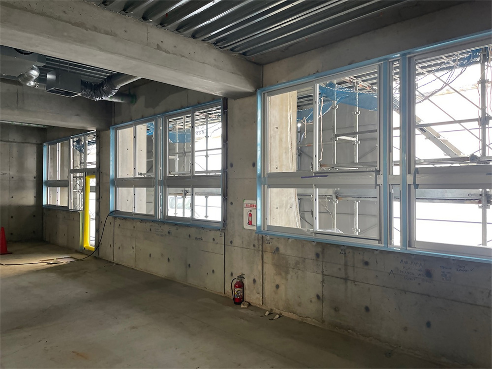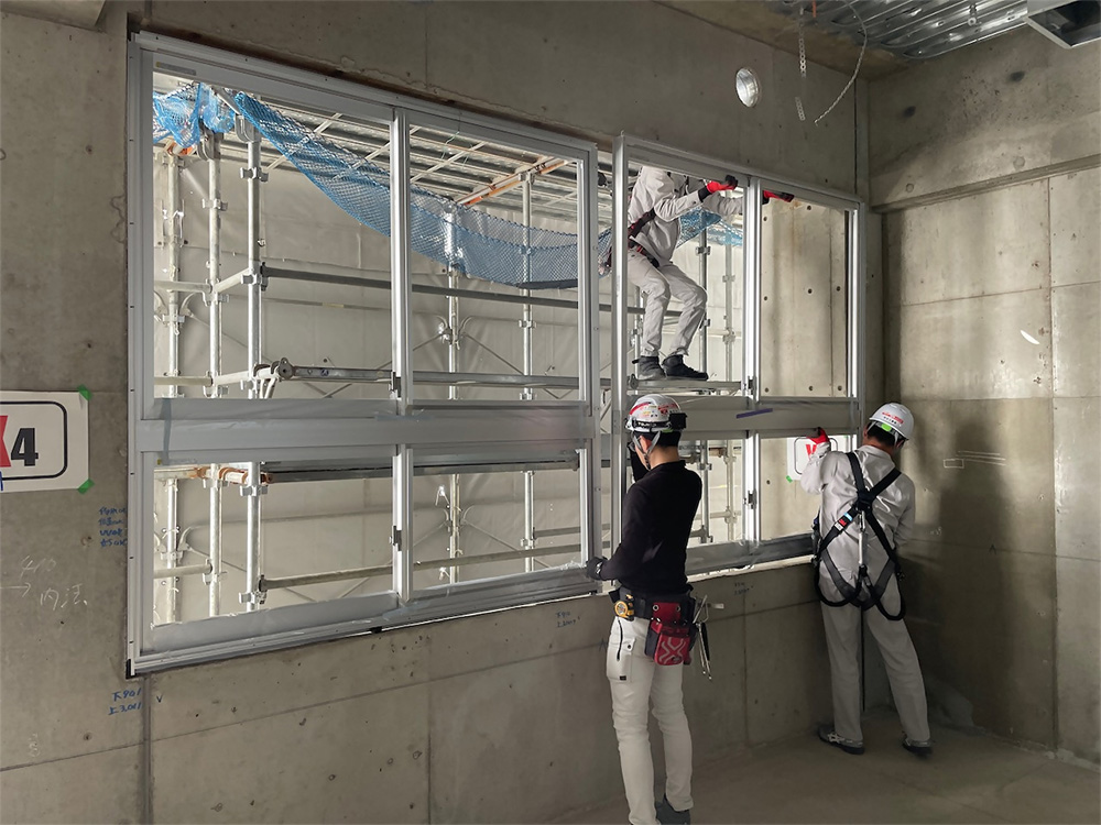 外壁の開口部に扉・窓などの建具を取り付けていきます。外壁の建具は、開け閉めの使いやすさだけではなく、建物の印象(デザイン)を大きく左右するため、形状や色などを選ぶこともとても重要な工程となります。