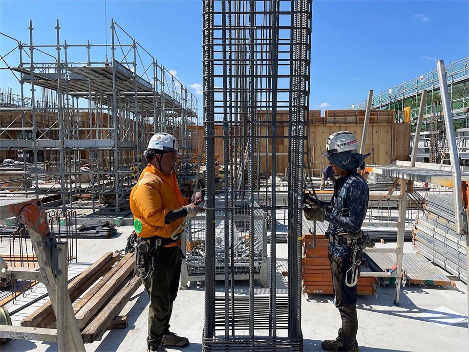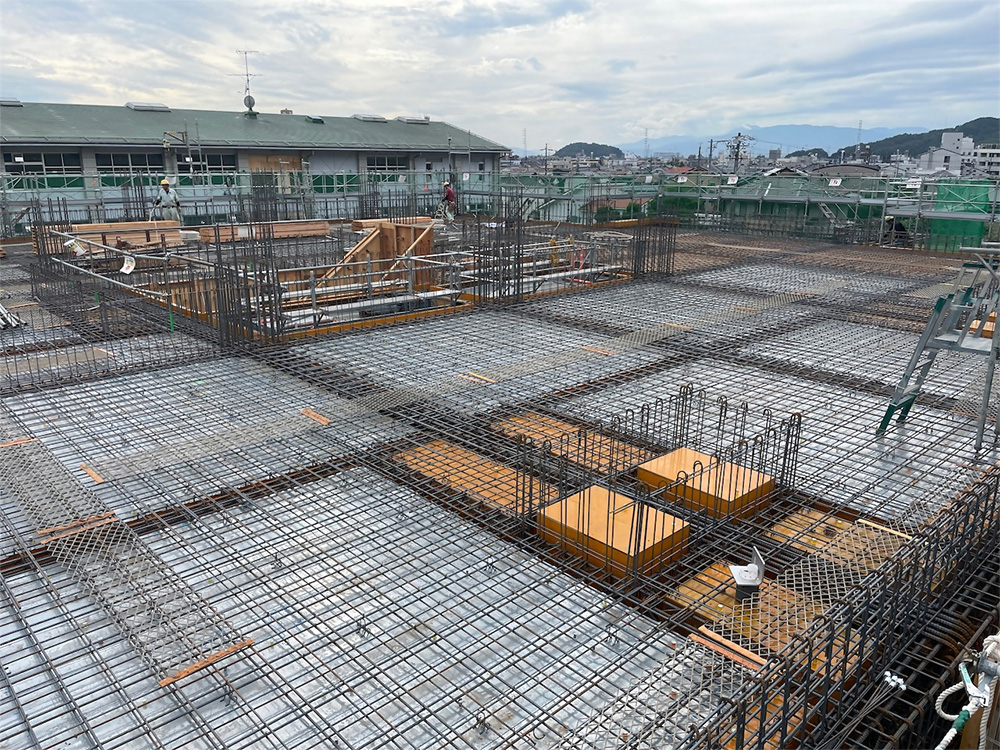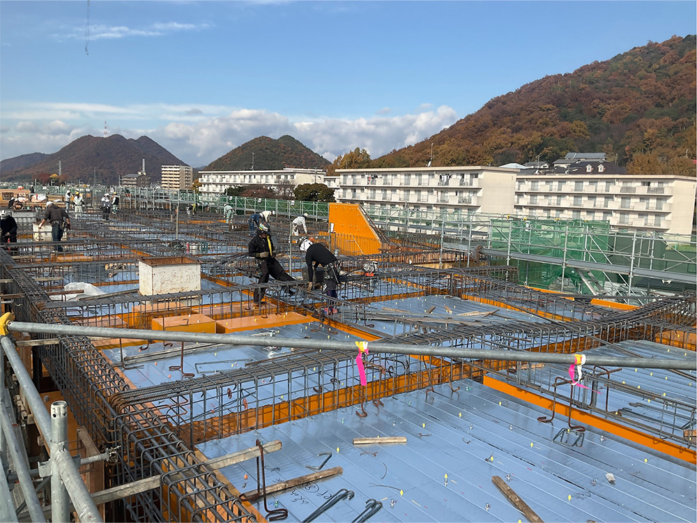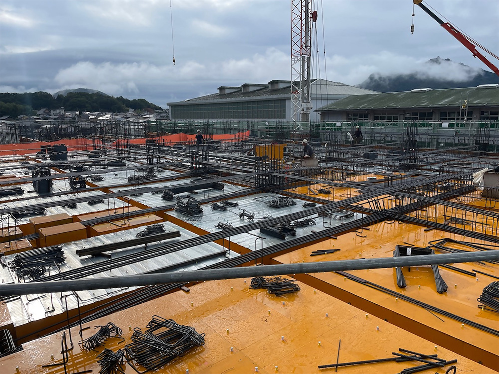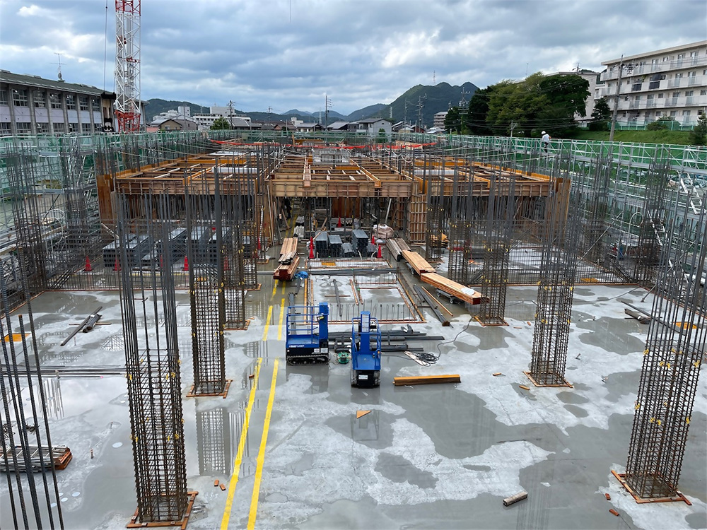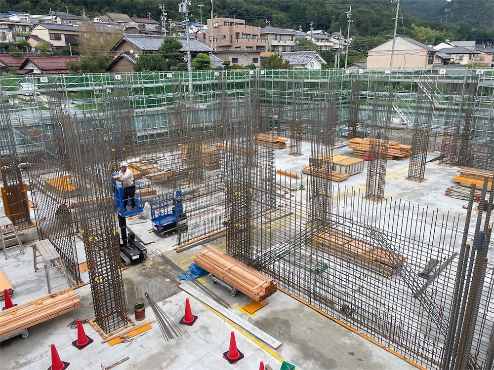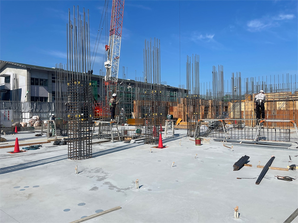 躯体工事は下の階から「鉄筋・型枠 → コンクリート打設」の工程を繰り返し、上の階へと工事を進めていきます。