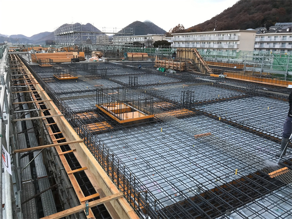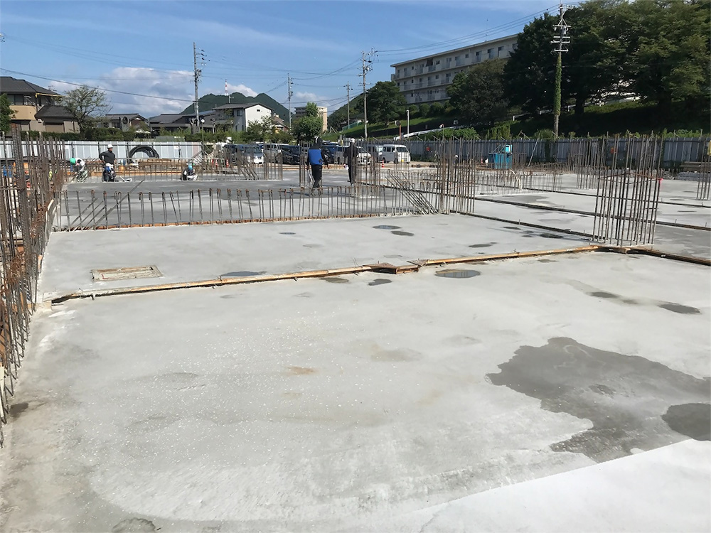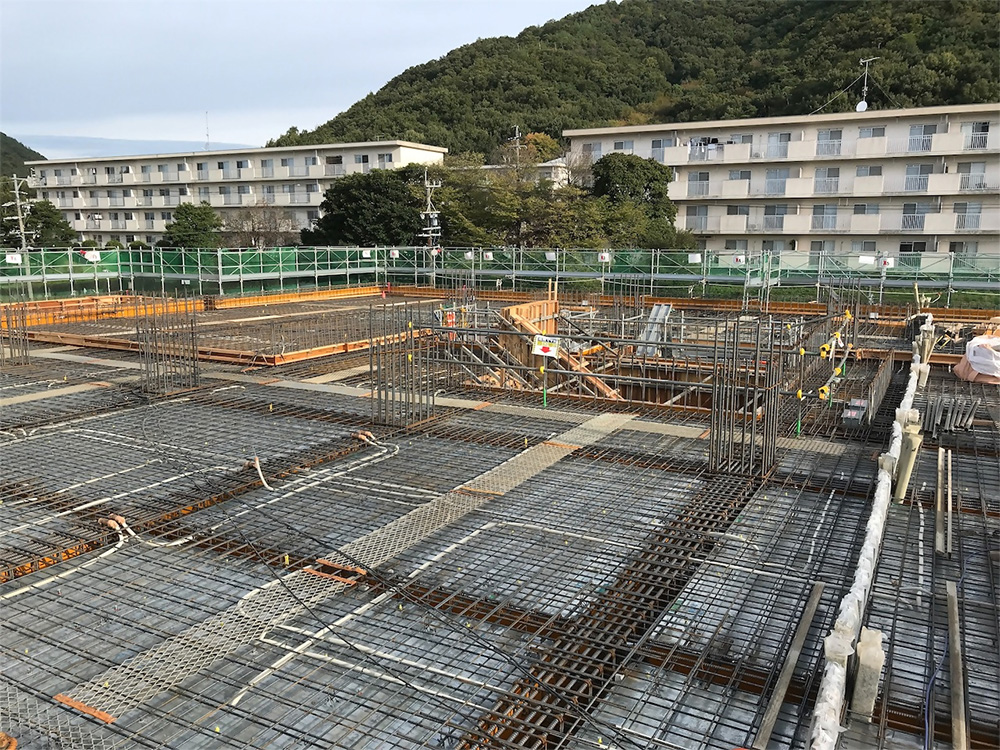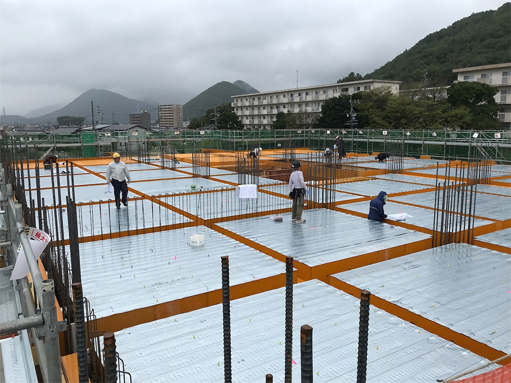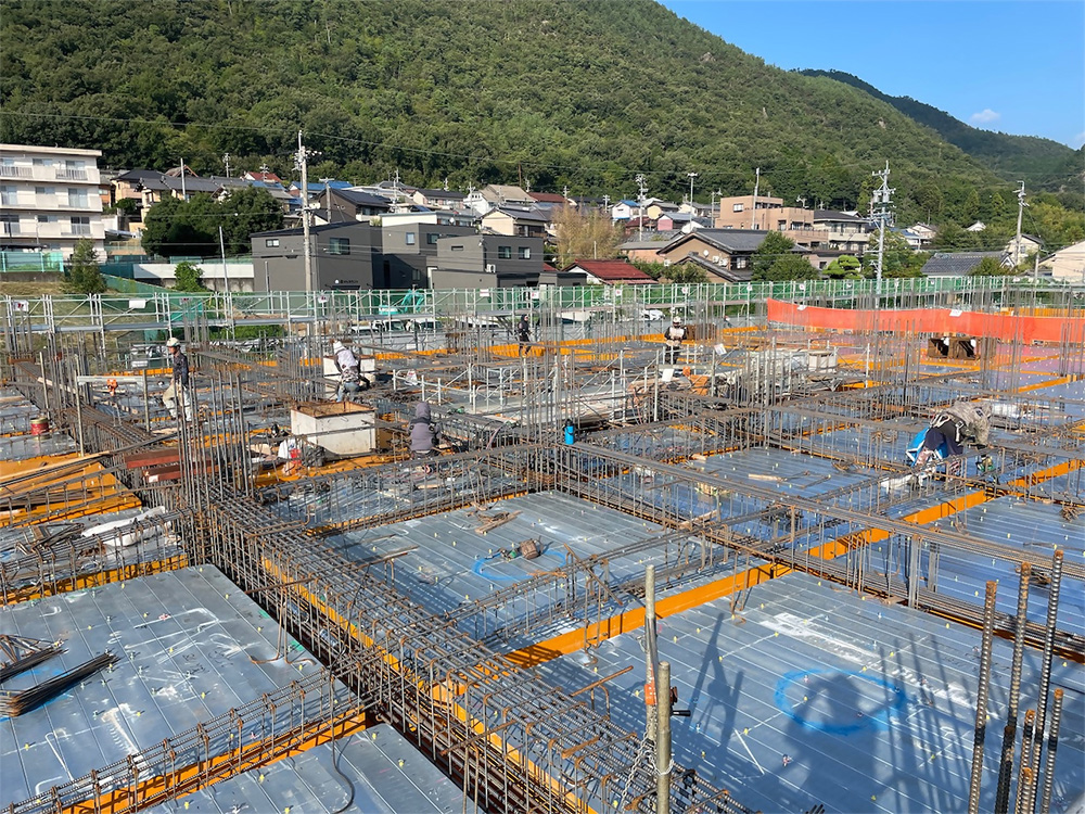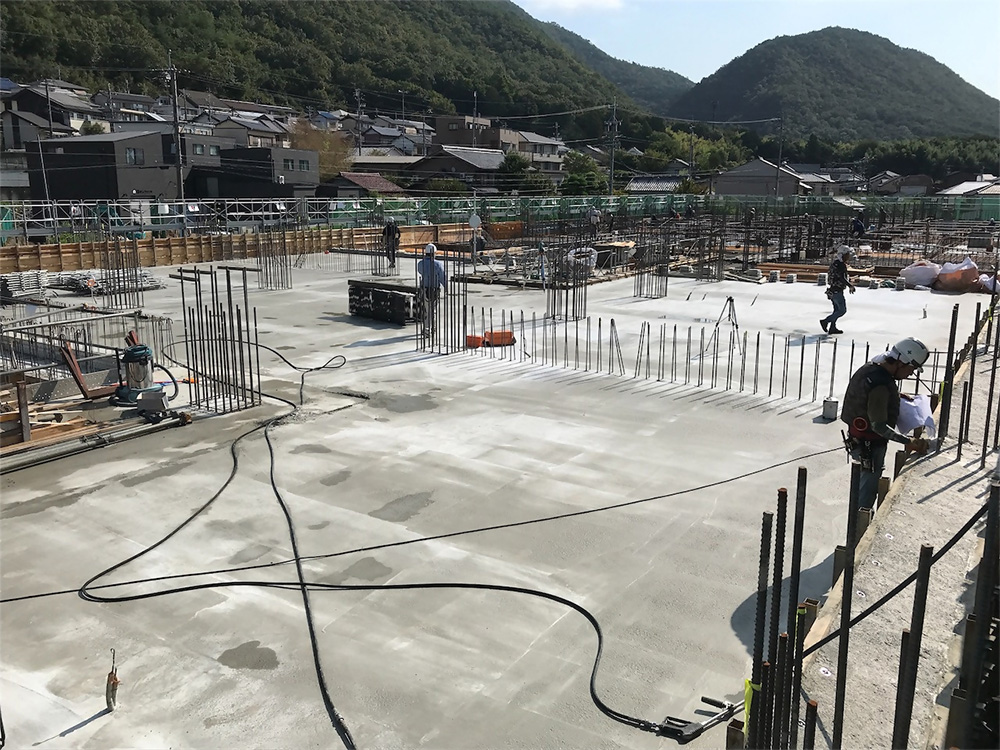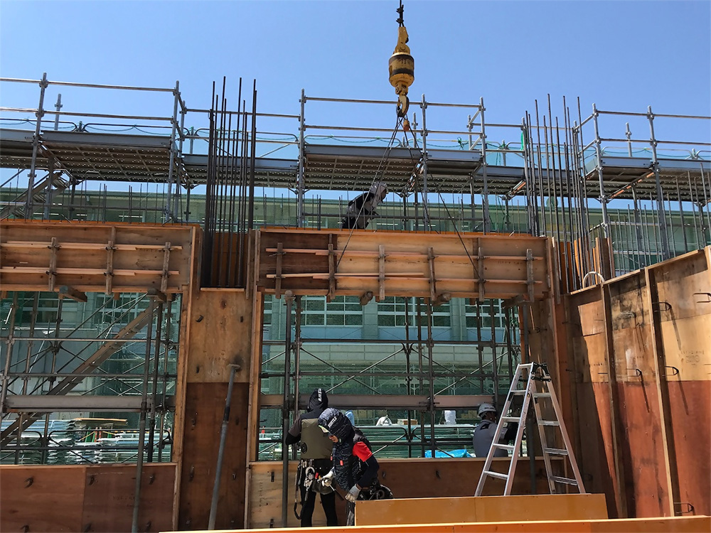 躯体工事は下の階から「鉄筋・型枠 → コンクリート打設」の工程を繰り返し、上の階へと工事を進めていきます。