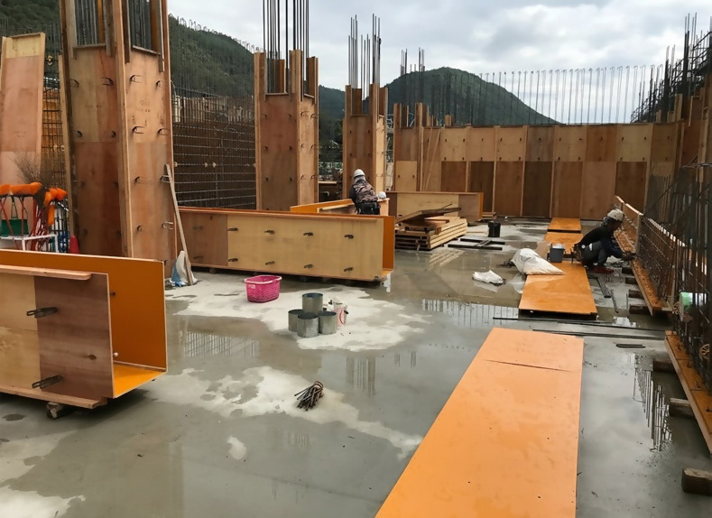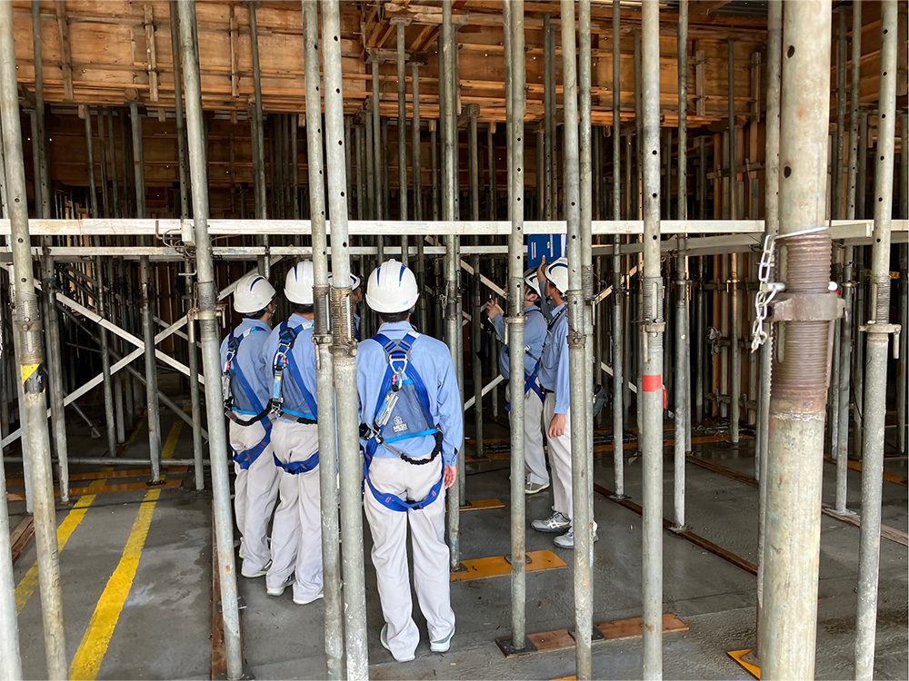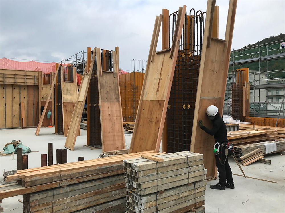 基礎工事と同様に、柱や梁、壁、床などの鉄筋を組み立て、コンクリートを打設するための型枠を建て込みます。梁・床などは型枠を支えるため、パイプサポートと呼ばれる支柱を用います。
