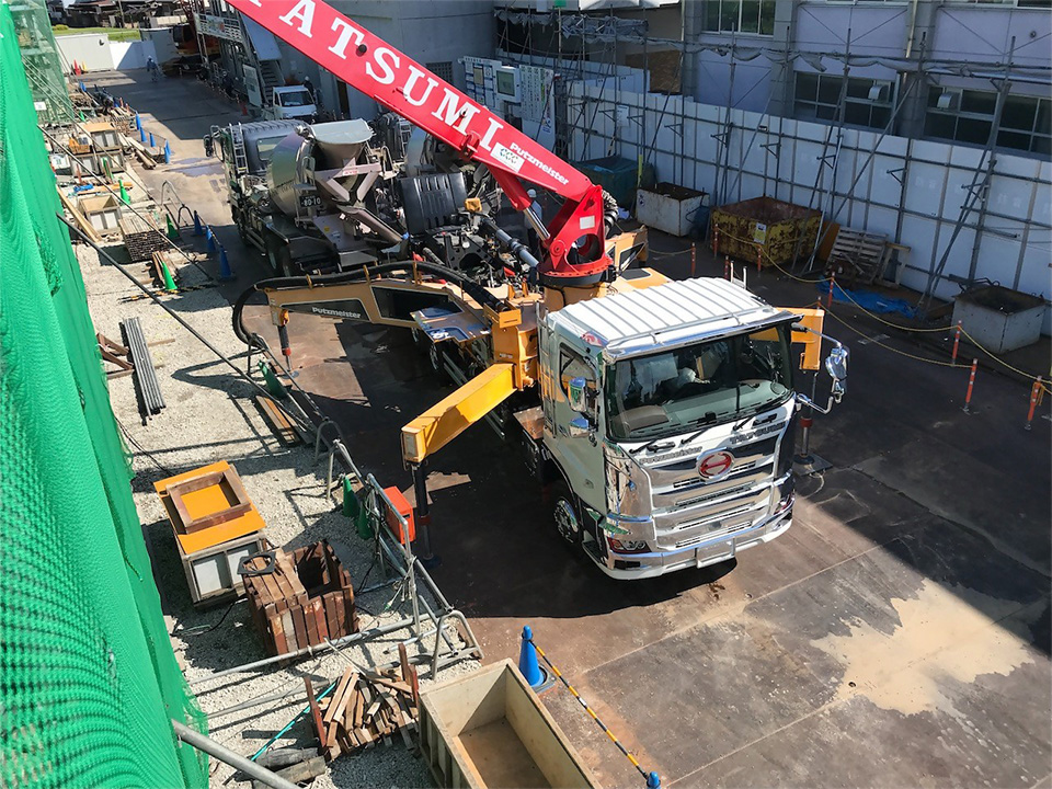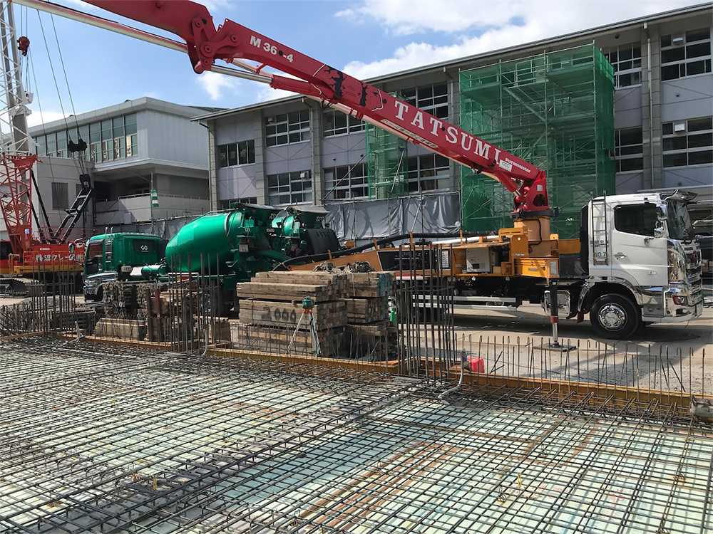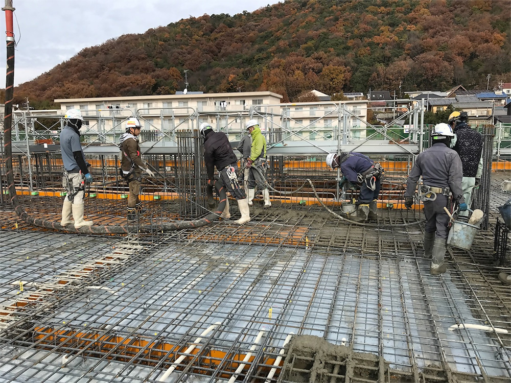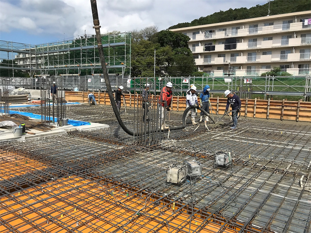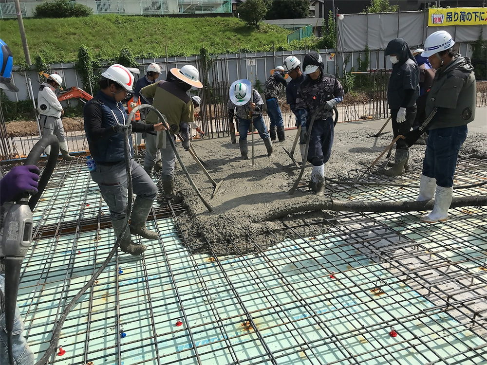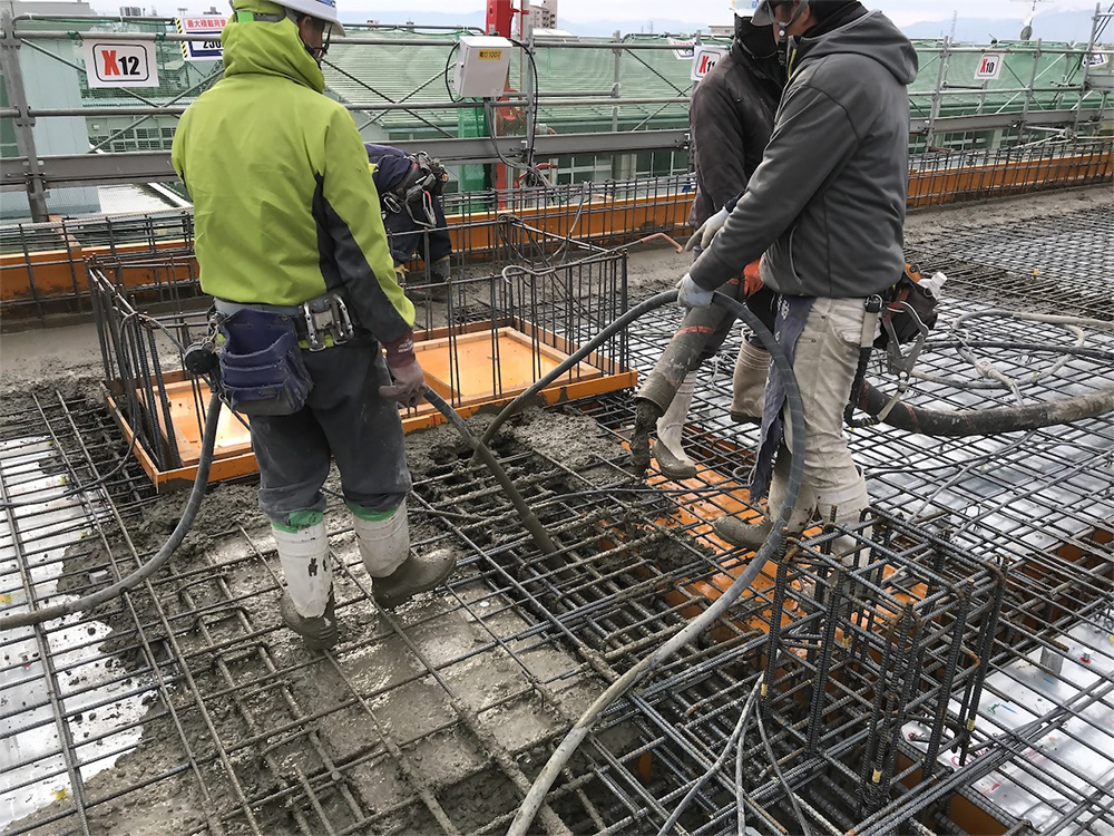 基礎工事と同様に、ミキサー車で運搬してきたコンクリートをコンクリートポンプ車で打設する箇所に流し込み、型枠の隅々までコンクリートが充填されるよう振動棒(バイブレーター)で加振し、コンクリートを締固めていきます。