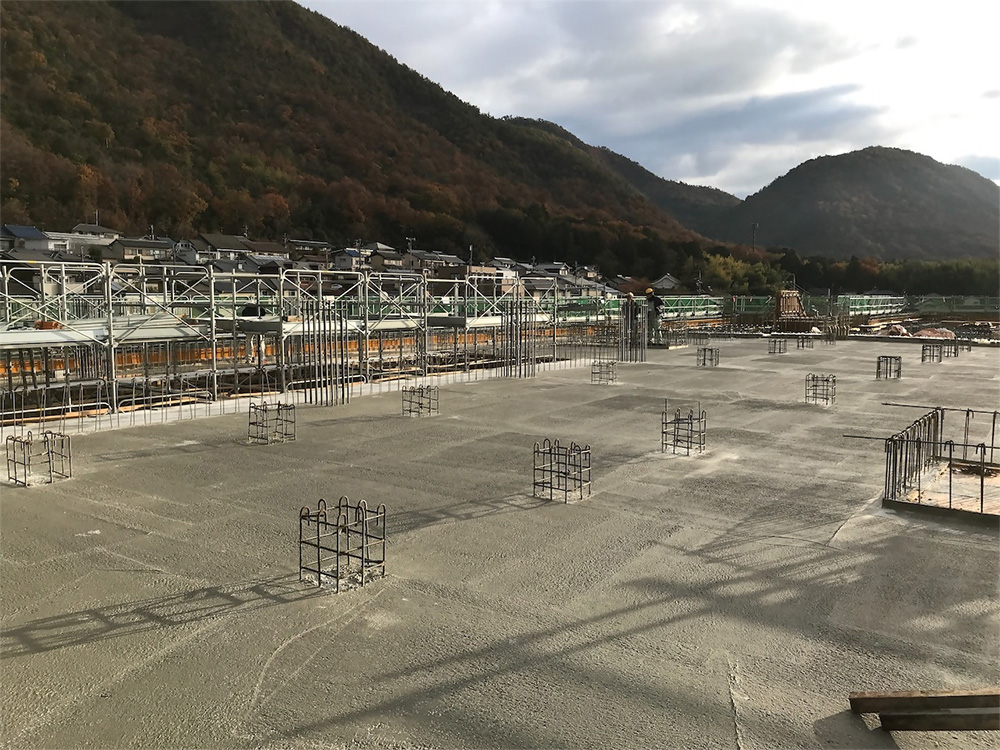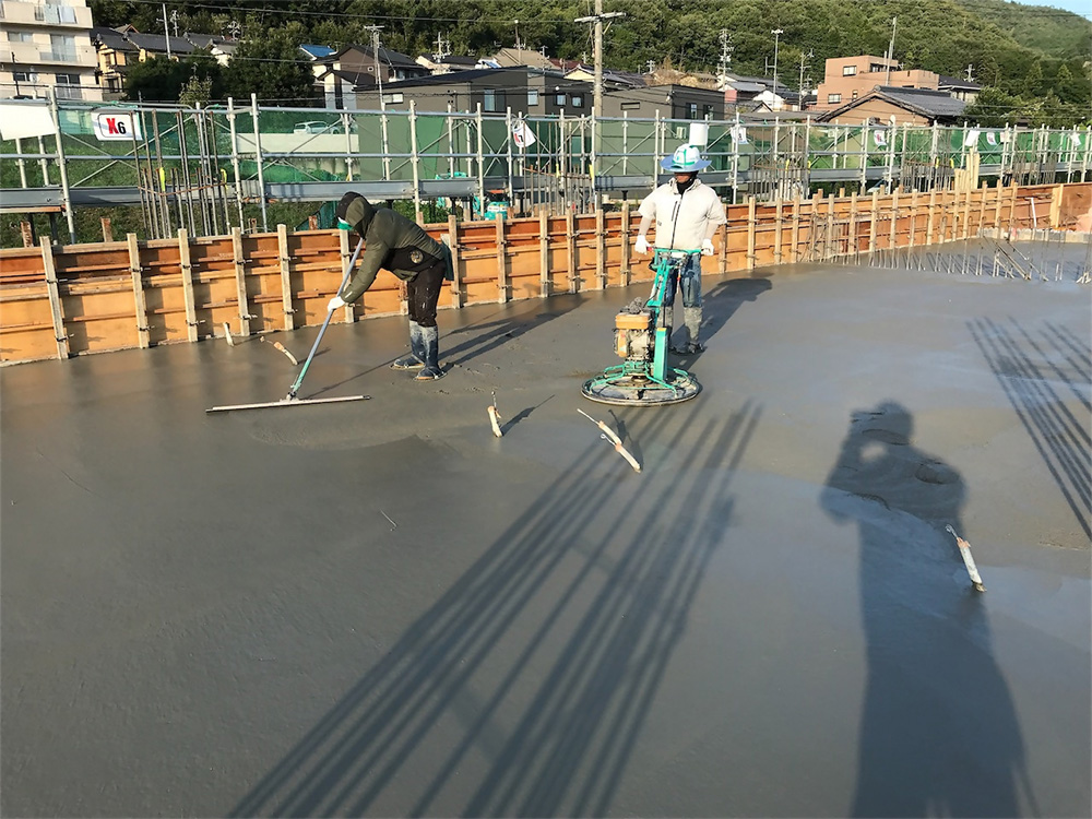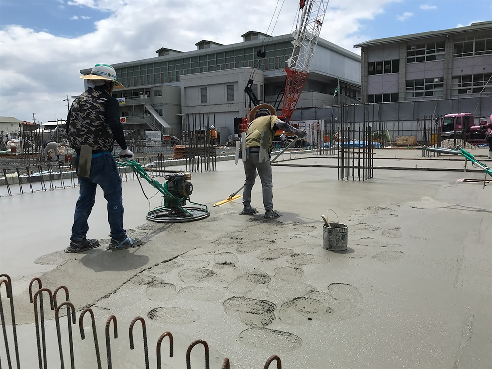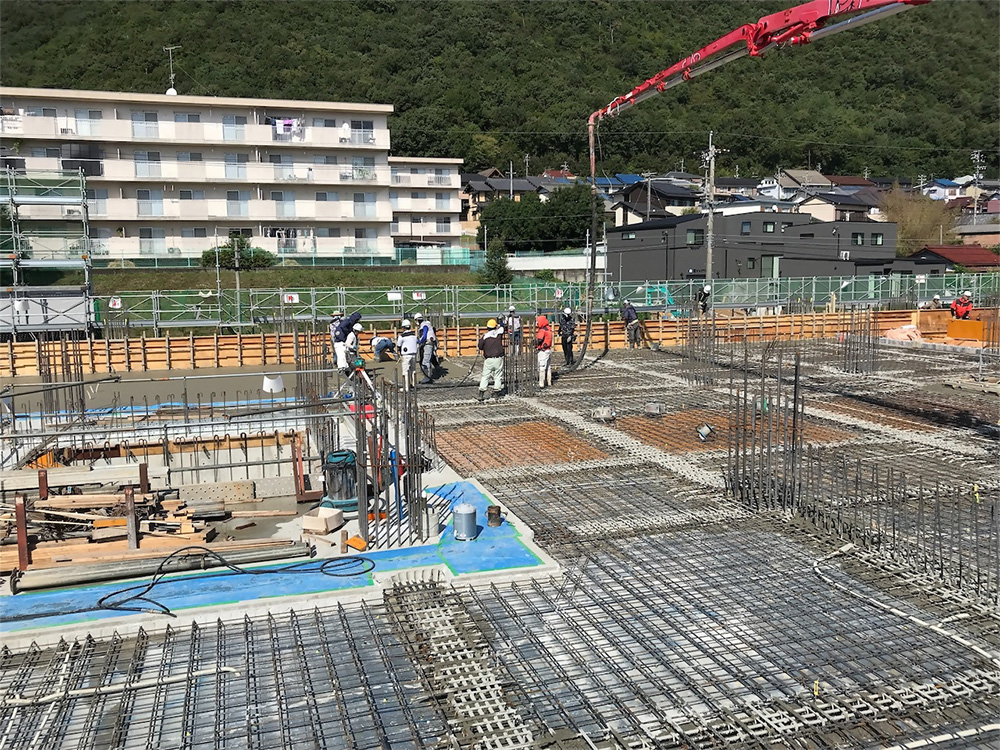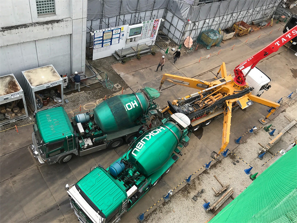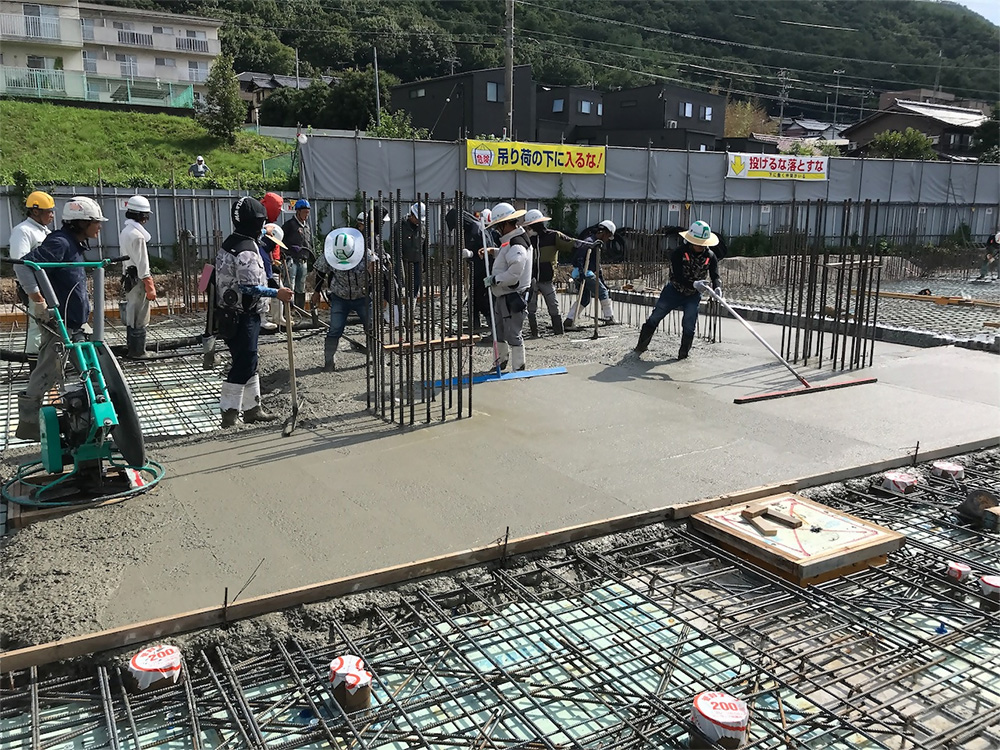 基礎工事と同様に、ミキサー車で運搬してきたコンクリートをコンクリートポンプ車で打設する箇所に流し込み、型枠の隅々までコンクリートが充填されるよう振動棒(バイブレーター)で加振し、コンクリートを締固めていきます。